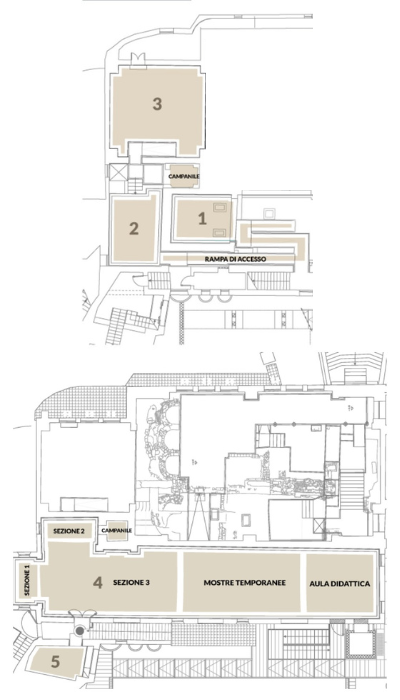 La visita inizia dall’abside della navata di ingresso (1), attraversa le rampe, prosegue nella sacrestia (2), nell’abside maggiore (3) e poi, al piano superiore, nella “Sala della Buona Morte” (4) e nella saletta antistante (5).